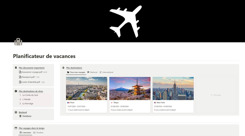 Découvrez le modèle Notion ultime pour organiser vos vacances de manière simple, claire et efficace. Conçu pour vous permettre de tout planifier sans rien oublier, ce modèle est votre compagnon indispensable pour des vacances réussies et sans stress.
