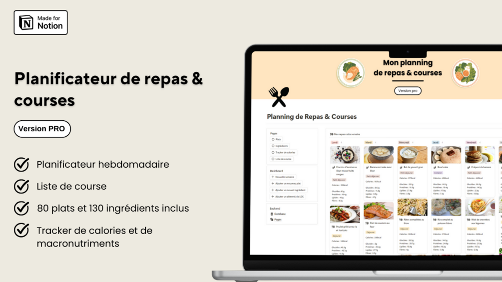 Ce planificateur de repas & courses est un modèle Notion très complet qui te permet de :