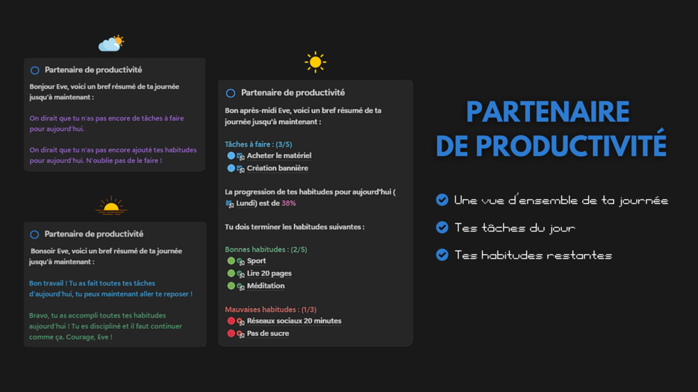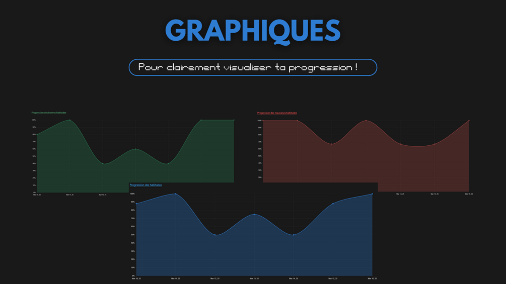 Suis tes HABITUDES QUOTIDIENNES et visualise tes progrès quotidiens, hebdomadaires, mensuels et annuels, tandis que ton partenaire de productivité te donne en un seul coup d'œil, un résumé des tâches et des habitudes qu'il te reste à accomplir pour la journée.